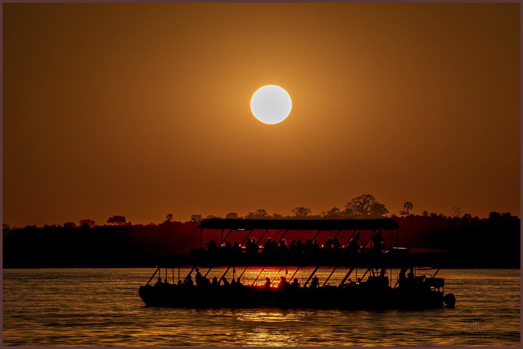 Navegando al atardecer por el río Zambezi entre Zimbabwe y Zambia.